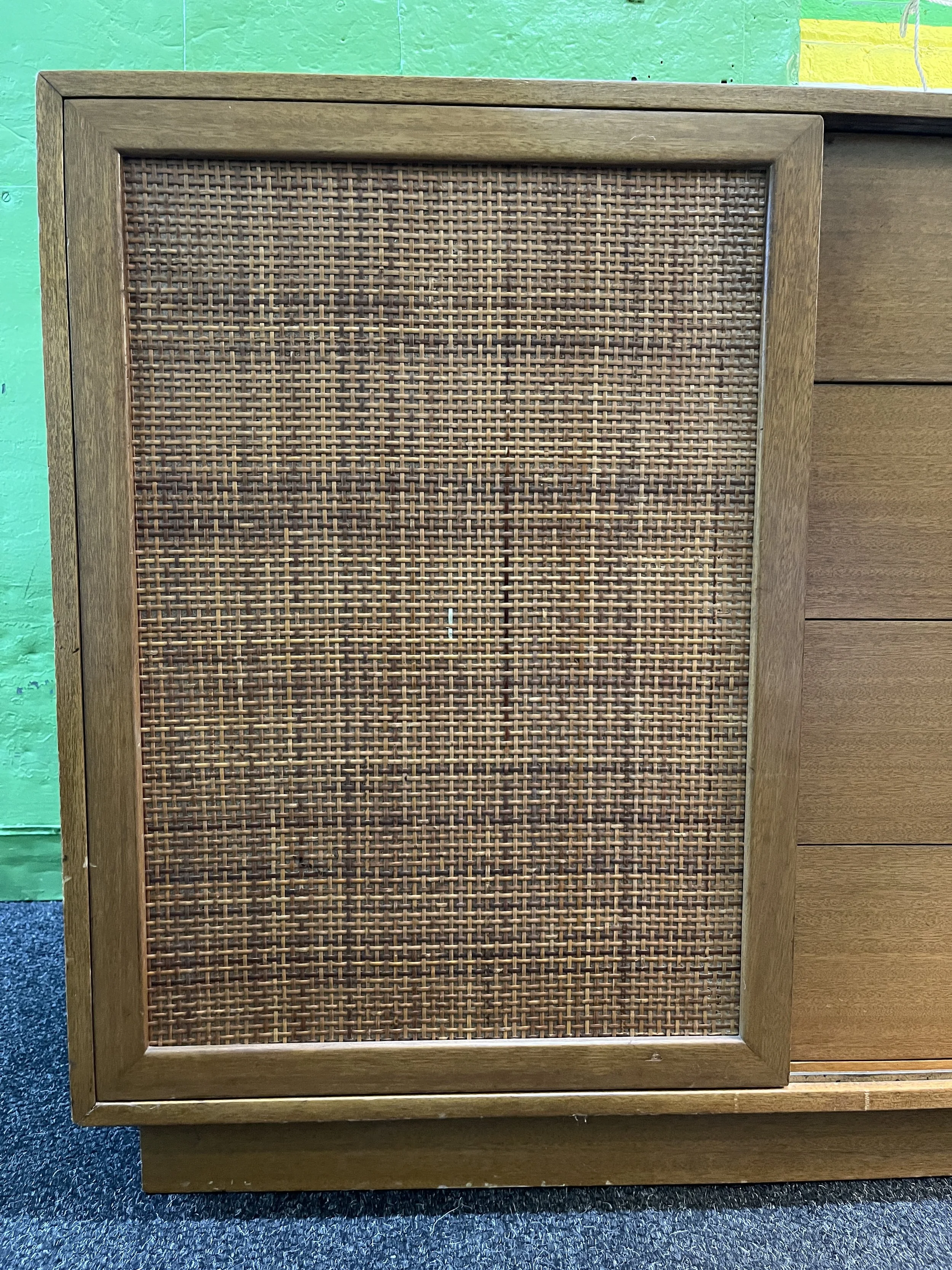 This is one absolutely beautiful Harvey Probber mahogany and cane sliding door credenza 1970s. This piece is outfitted with four long drawers on the middle, four smaller drawers on the left side, and three shelves that slide out on the right side. This piece is the perfect touch for any mid-century style interior.